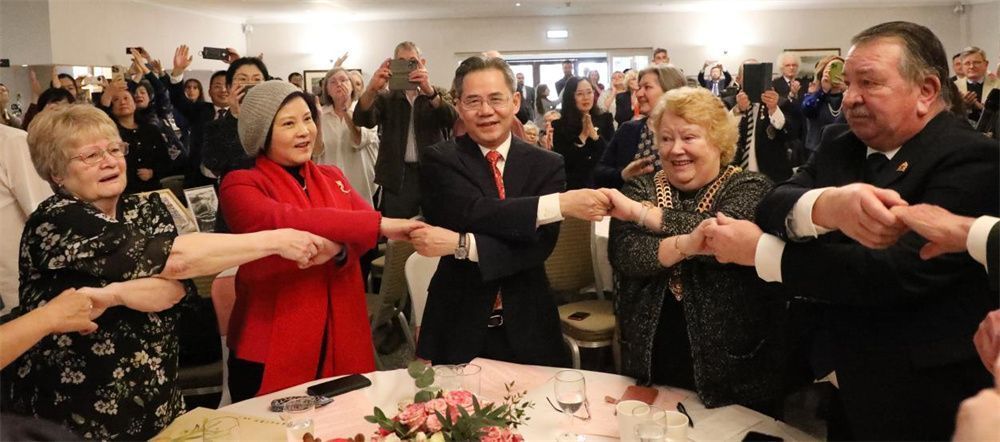 现场中英嘉宾手拉着手,共唱《友谊地久天长》。(图片来源:中国驻英使馆何庭德摄)