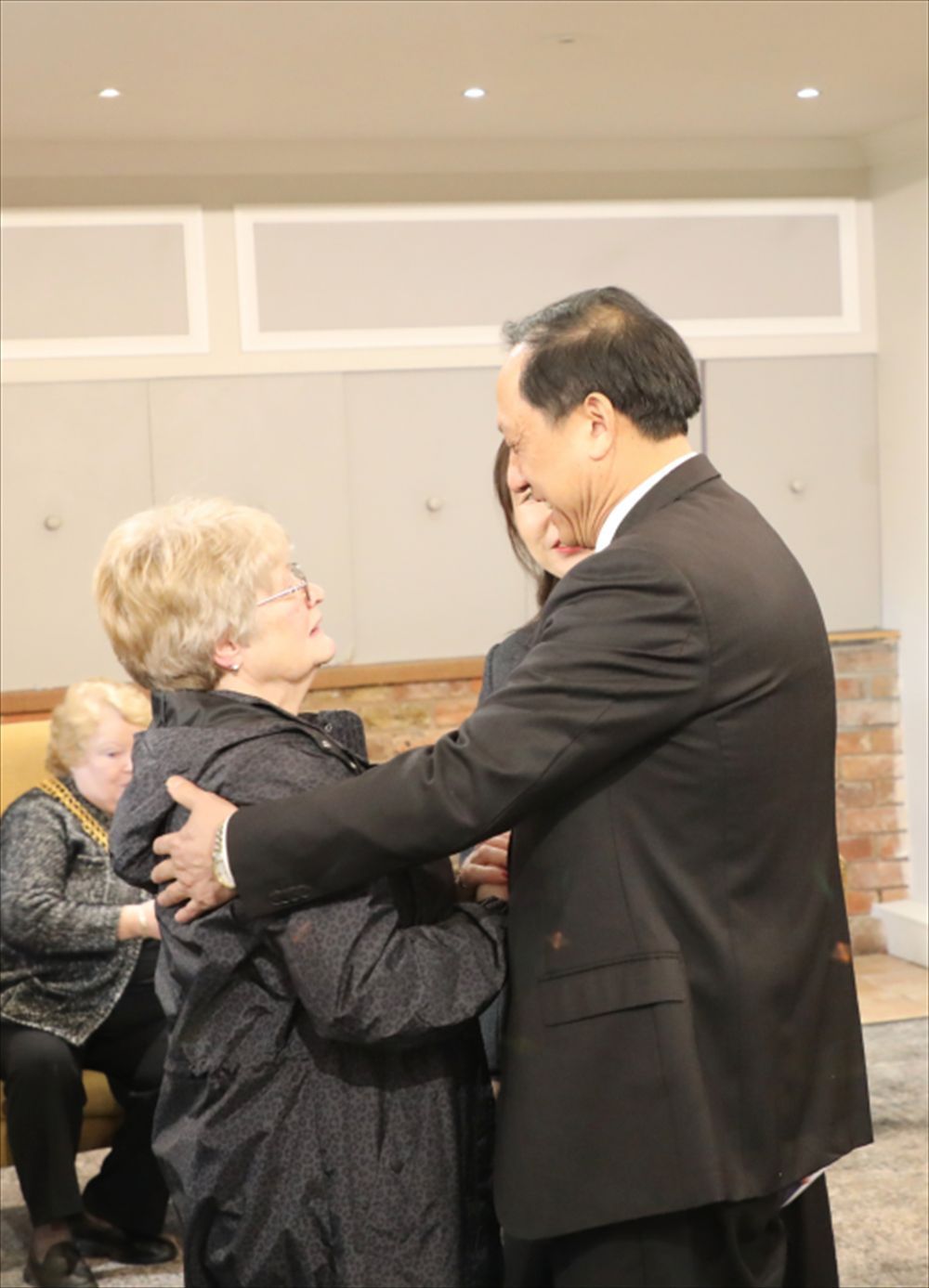 最后一位幸存者女儿维尼女士在与舟山渔民后代吴布伟拥抱后落泪。(图片来源:中国驻英使馆何庭德摄)