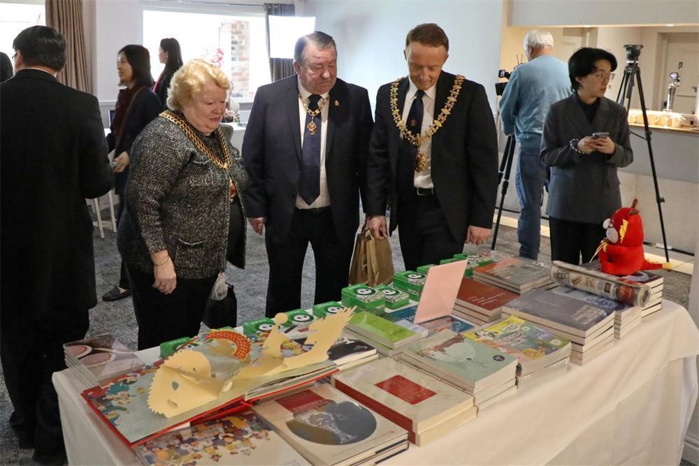 格洛斯特市长凯西和同事们在中国文创展品前驻足。(图片来源:中国驻英使馆何庭德摄)