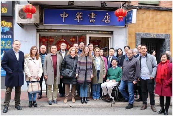 中国驻西班牙大使馆和马德里市政府官员与朱晓海等旅西侨界代表在中华书店门前合影。