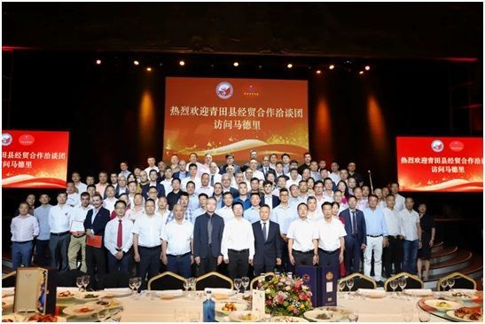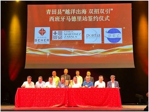 青田县县长潘伟、中国驻西班牙大使馆领侨处主任张进、西班牙青田同乡会会长朱晓海和中西百货协会执行主席夏永平共同见证青田县与当地的外商企业和华商企业分别签署了多项合作意向书。