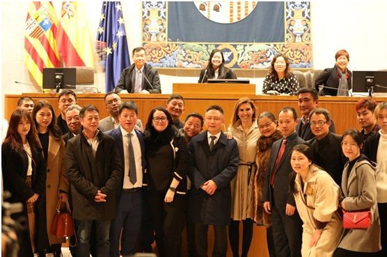 朱晓海携西班牙青田同乡会青委部成员及协会成员与阿拉贡自治区议员、萨拉戈萨当地侨界代表在阿拉贡自治区议会会址——阿尔哈费里亚宫合影。