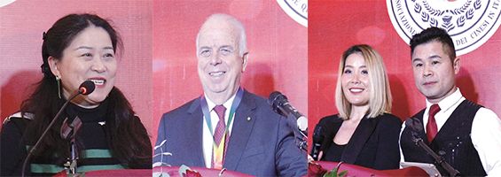 图片人物依次为意大利(中国)侨商总会荣誉会长阮立伟、意大利罗马华侨华人联合总会理事长、意大利(中国)侨商总会荣誉会长林美银、顾问朱玉华。