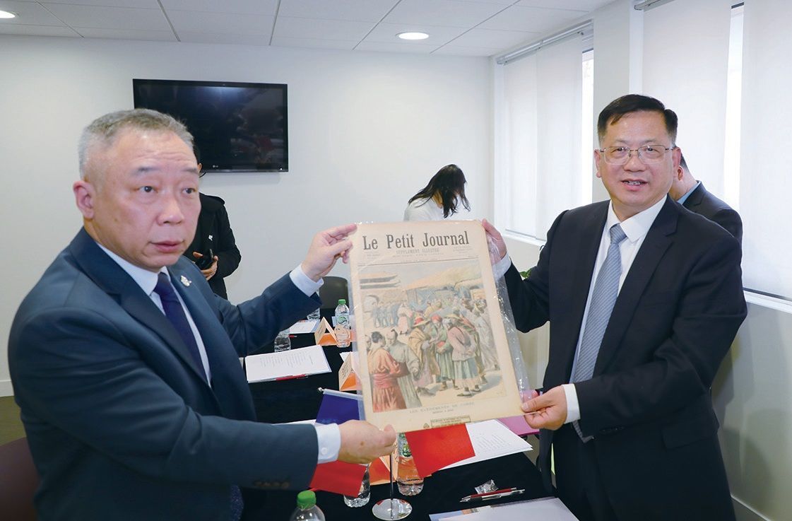 钟诚社长向严卫群书记赠送十九世纪巴黎出版的彩绘《小报》,其中报道了甲午战争。