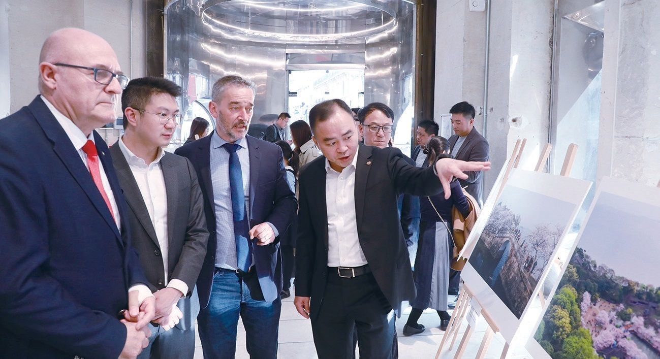 无锡市文化旅游发展集团有限公司总裁邱亚君(右1)通过图片展向法中嘉宾介绍无锡特色。