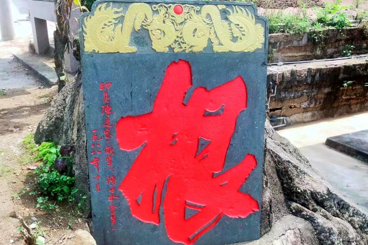 图为印尼侨胞陈壬水在后康村祖祠边立起的刻有“根”字的石碑。(图片来源:福建漳浦县融媒体中心供中新社)