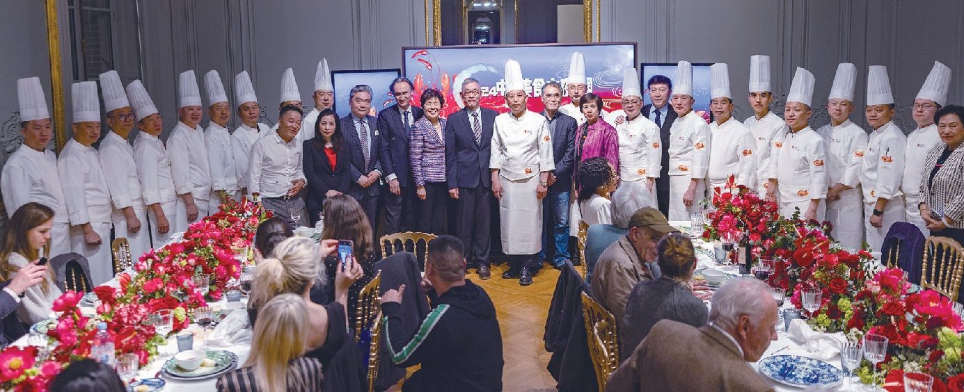 【欧洲时报记者陈远帆巴黎报道】4月16日,巴黎中国文化中心联合中国烹饪协会共同举办了“你好中国——美食之夜”活动,来自中国各地的19名大厨联袂烹制了精美佳肴,为中法嘉宾奉上一场美食盛宴。联合国教科文组织副总干事曲星,中国驻法国大使馆文化处公使衔参赞严振全,中国常驻联合国教科文组织代表团副代表王盈,巴黎中国文化中心主任刘红革,中国烹饪协会会长杨柳,欧洲时报文化传媒集团总裁、欧洲时报社长钟诚,法语国家议会大会主席达米安·赛斯兰(Damien CESSELIN),巴尔扎克故居纪念馆馆长伊夫·加尼厄(Yves GAGNEUX),法国国际旅游联合会主席埃里克·杜吕克(Éric DULUC),联合国世界旅游组织特别顾问、名誉秘书长玛丽-皮埃尔·布歇·霍利耶(Marie-Pierre BOUCHER HOLLIER),法国文化部名誉戏剧总监让-皮埃尔·余尔斯(Jean-Pierre WURTZ),法兰西艺术院通讯院士高立昂(Jean-François COLLIGNON),法国电视二台著名新闻主持人巴特夏·莎邦婕(Patricia CHARPENTIER)等法国各界嘉宾60多人出席晚会。嘉宾们共同聆听了美妙的中国丝竹之声,在品味中国美食文化中畅叙中法友谊。活动现场