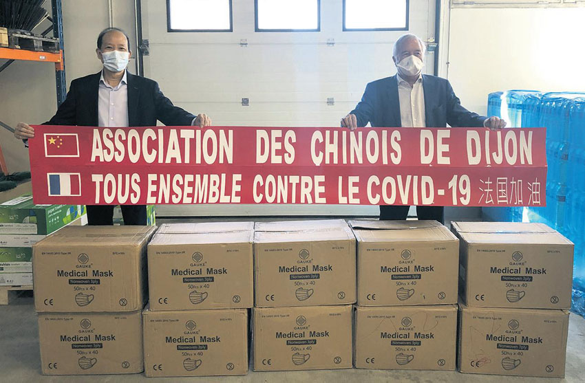 胡忠胜告诉记者,刚刚过去的2020是极不平凡的一年,病毒肆虐,疫情反复,但第戎华人协会与全球华人华侨一样与全世界各国人民一起,众志成城,风雨同舟,勇担使命,共同抗疫,互帮互助,砥砺前行。在去年中国发现疫情的时候,协会参与了为中国捐赠抗疫物品的活动。在法国疫情严重时期的4月16日,协会从中国购买了几万只医用口罩,捐赠给了第戎市政府,协助当地抗疫。第戎市市长、法国前劳动部部长弗朗索瓦·勒布萨曼先生(Fran.ois Rebsamen)到场接受捐赠,对协会义举做出高度评价。政府工作人员随后将口罩分到了医院、警察局及其他抗疫一线工作人员手中。在城市危难时刻,协会的这一义举也受到了当地社会的一致好评。