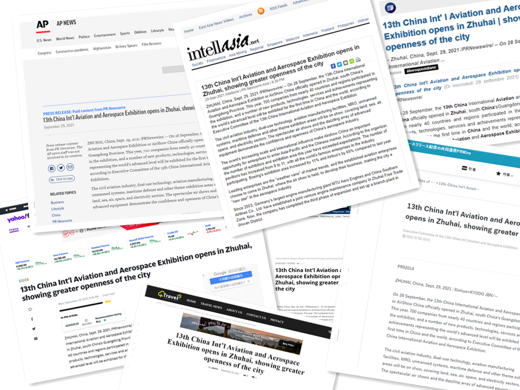 9月29日,在第十三届中国航展开幕的次日,全球通讯社联盟以《13th China Int'l Aviation and Aerospace Exhibition opens in Zhuhai,showing greater openness of the city》(中译名:蓝天盛会折射珠海开放水平不断跃升)为题发文,解读航展举办地珠海的雄厚的产业实力和开放机遇。截至10月1日,文章已被美联社、雅虎、道琼斯旗下Market Watch、埃菲社、俄塔社、法新社、日本共同通信社、韩国Naver、福克斯、CBS、NBC、实时财经新闻网站Benzinga等500多家海外主流媒体全文转载,覆盖用户超过1.2亿人次。