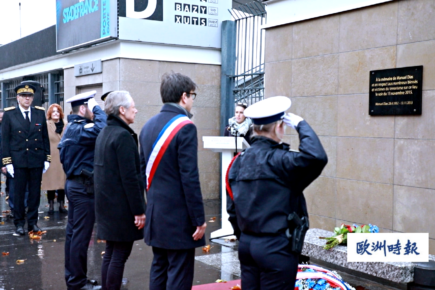 在巴黎北郊圣德尼市的法兰西体育场D号门前,法国总理博尔内和圣德尼市长哈诺廷向八年前2015年11月13日,巴黎恐袭事件始发地的遇难者的纪念铭牌敬献鲜花,默哀一分钟致意,并高唱马赛曲。