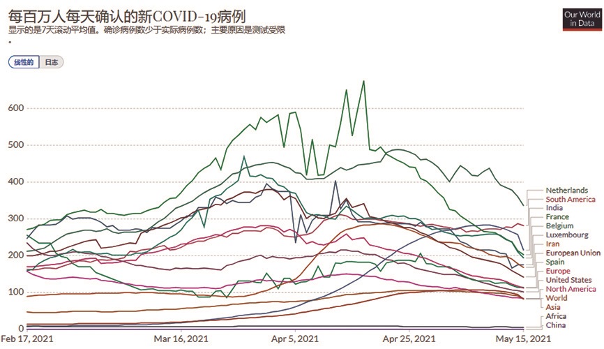 这个图中可以观察到的第二个重要现象是,一个多月以来,西方世界的疫情已经明显下降。亚洲也只是在印度数字的带动下,才有上升。