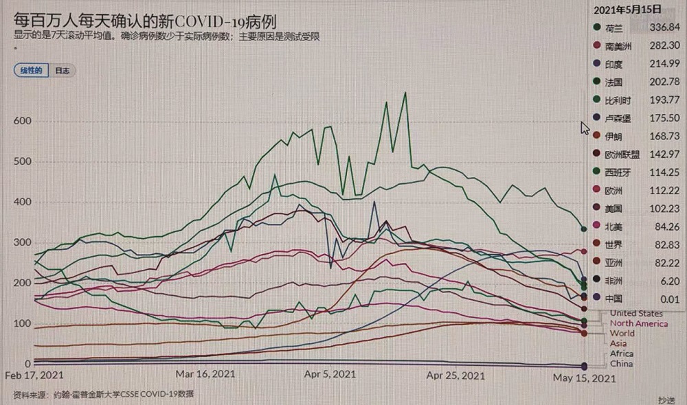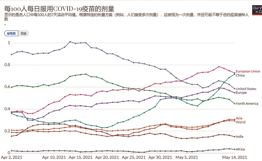 一个明显的新现象是,北美两国的每日施打量一个月以来就一直在下降。据说愿意打的基本上都打了,剩下的人多数都不乐意打。现在美国各地都在各出奇招,动员他们去打疫苗。