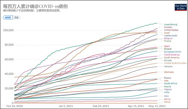 这个图的标题可以由google自动翻译成中文,但图内的标记却不能自动翻译。横轴是时间。这个轴呈现的时段范围可以由你任意放缩。这点真是太好。纵轴表达的如标题所说,是累计的确诊病人数经过人口加权,排除了规模影响的一个权数。