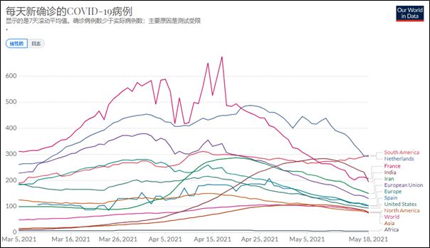 这个图中可以观察到的第二个重要现象是,一个多月以来,西方世界的疫情已经明显下降。亚洲也只是在印度数字的带动下,才有上升。