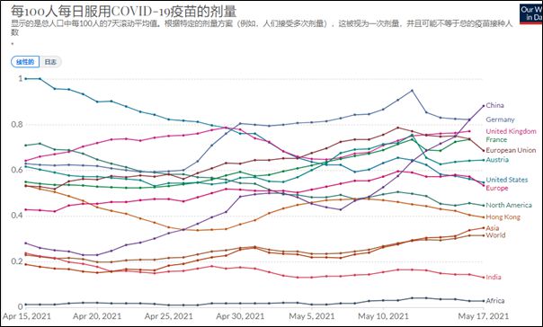 一个明显的新现象是,北美两国的每日施打量一个月以来就一直在下降。据说愿意打的基本上都打了,剩下的人多数都不乐意打。现在美国各地都在各出奇招,动员他们去打疫苗。