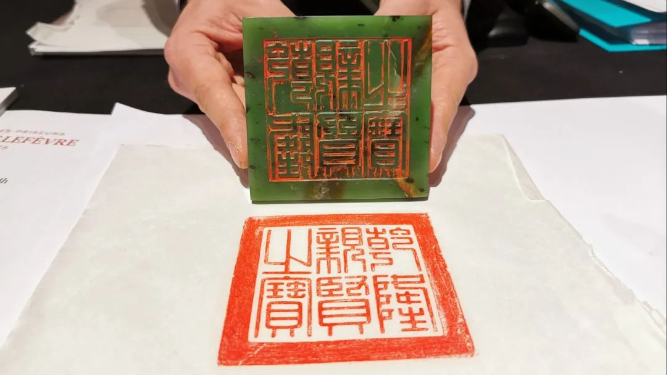 4月5日,在巴黎8区一间拍卖行,拍出一枚刻有“敕命之宝”满汉铭文的青玉印玺。