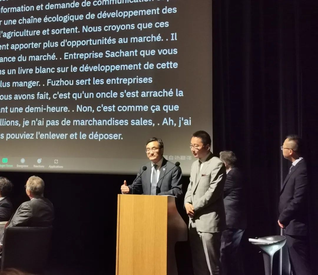 中国电信欧洲总经理曹力代表中国企业发言称,中国电信致力于促进法中、欧中数字丝绸之路的建立。中国电信在中国、亚太地区建立了丰富的网络链接、云节点资源,并拥有面向行业客户的深度融合解决方案。中国电信愿与法、中合作伙伴一起,搭建完善的生态服务环境,服务中、法企业的需求,促进中法和中欧之间的经贸合作交流,并真正成为中法和中欧之间的纽带。值得一提的是,除了现场翻译,大屏幕上还展现了讯飞听见的实时语音转法文内容。