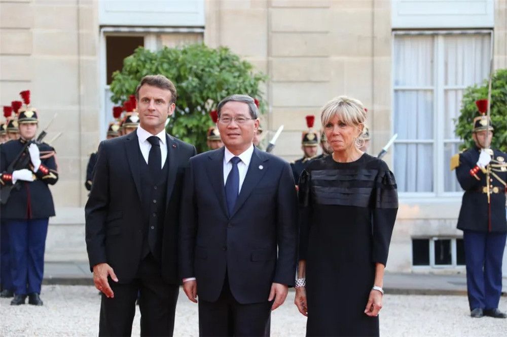 李强总理6月21日-23日对法国进行正式访问。这是马克龙总统和夫人在爱丽舍宫欢迎李强总理。(图片来源:欧洲时报记者黄冠杰 摄)