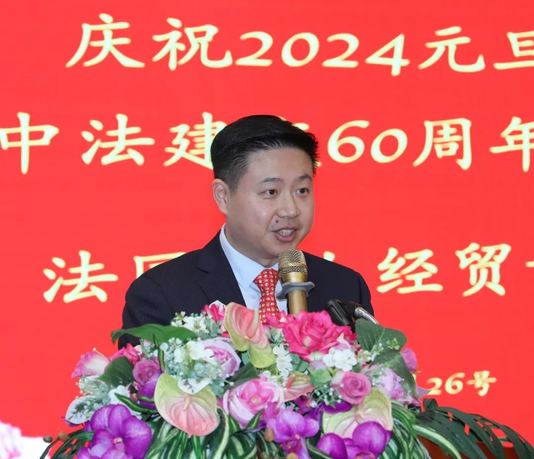 法国华侨华人会常务副主席兼秘书长董德义代表侨界向法国华人经贸协会送上新春祝福。他表示,协会在林东周会长及历届会长的带领下充满活力,会员爱国爱乡,会务蓬勃发展。不仅积极主动融入法国主流社会,还投身侨届组织的各项活动中,为侨团赢得声誉。作为两国友谊和关系不断加深的见证者、贡献者,我们愿意以庆祝中法建交60周年为契机,各兄弟侨团互勉共进,为中法两国的经济发展、文化交流等事业继续做出新贡献。