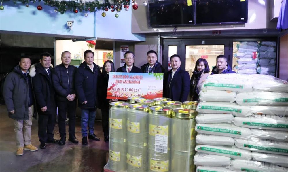 当天下午,法国华侨华人爱心会主任洪震波、名誉主任蔡足焕及协会成员蔡新土、郑品海、黄学铭、胡仁爱等代表协会来到法国爱心团爱心食堂,向爱心团捐赠了大米和食用油。这是爱心团继2022年首次向爱心团捐赠物资后的再次捐赠。法国爱心团发起人董凤珍、董浩等现场接受了捐赠。晚会上,在万磊参赞的见证下,董凤珍、董浩向爱心会颁发了捐赠证书。董凤珍代表受益人群向爱心会表达了感谢和感激之情。她还向大家介绍了这些年爱心团的工作,以及捐赠物品的去向。