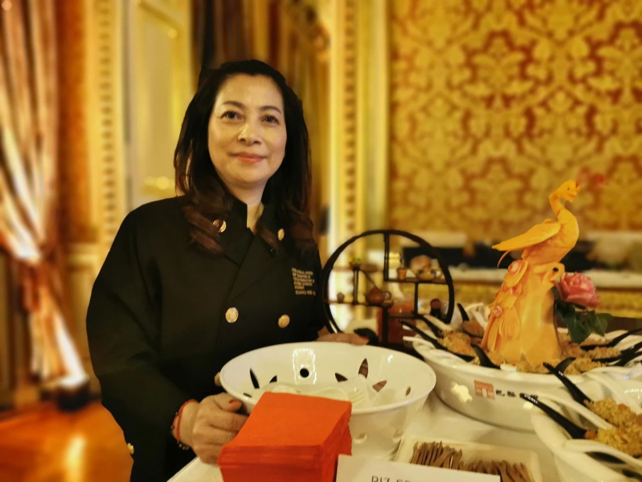 本次中餐专区的领军人——法国亚洲餐饮联合总会会长黄美娜女士在中国展台前。(图片来源:欧时大参微信公众号)