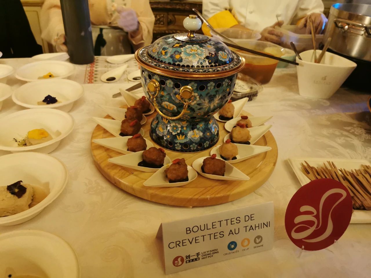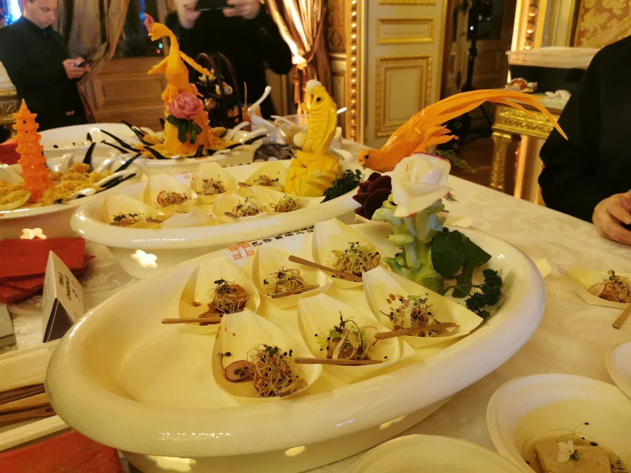 受疫情影响,世界中餐业联合会代表团今年依然无法赴约,在柳怡女士的倡议、组织下,法国亚洲餐饮联合总会中青年餐饮从业者群策群力,在很短的时间内研究和试菜,将中国传统的火锅,虾球,豆腐,炒饭,烤鸭等美食元素搭配法餐制作和排盘技艺,配以雕花,汉服等民族文化元素,呈现出色香味观俱佳的现代中餐创意美食。