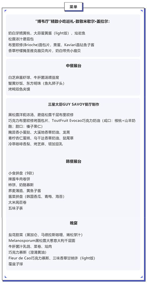 此次,“优秀学生代表”阿兰·杜卡斯和丹尼尔·布卢德以及米歇尔·盖拉德餐厅Les Près d'Eugénie(阿兰·杜卡斯第一份工作便是在此餐厅)的厨师一起呈现了盖拉德的标志性菜肴。例如,布卢德餐厅奉上的一道松露奶油小吃便是以米歇尔·盖拉德1978年中国之行品尝的街头美食为灵感。