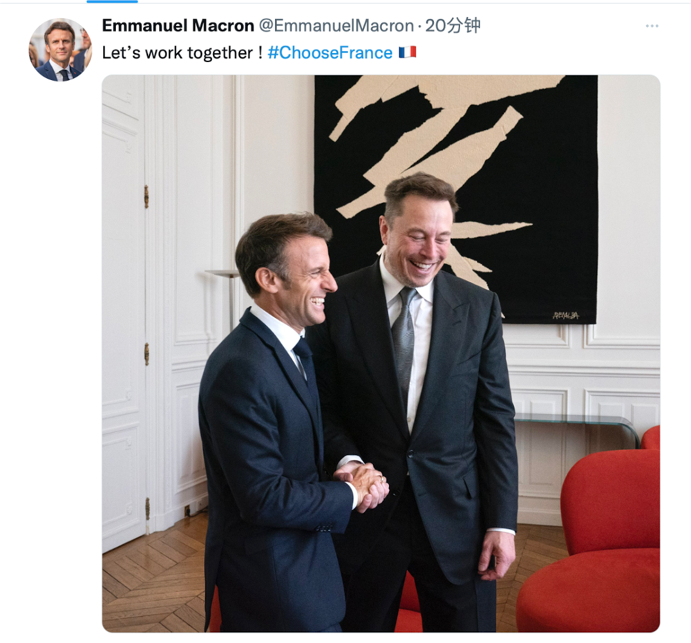 ▲法国总统马克龙5月15日在爱丽舍宫会见前来参加“选择法国”(Choose France)招商引资峰会的特斯拉汽车公司和SpaceX的创始人、推特最大股东马斯克。(推特截图)