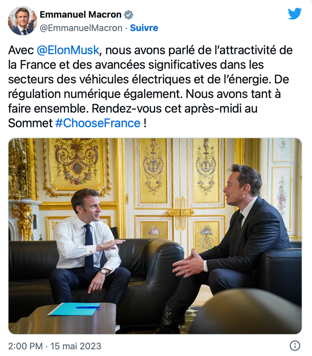 “今天,法国充满了前所未有的吸引力,”他说,“当然,与其他国家的竞争很激烈,但我们将施展浑身解数去吸引最优秀的——马斯克。”