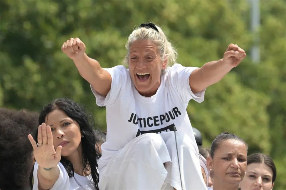 ▲29日,少年Nahel的母亲Mounia(中)在悼念游行中被示威者人群扛起。(法新社图)