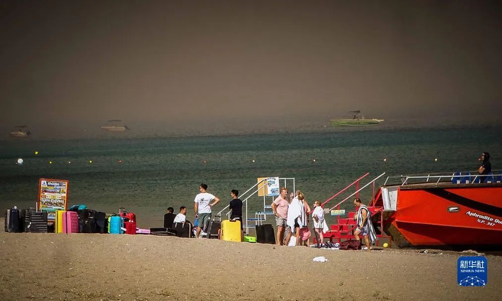 7月22日,在希腊罗德岛,人们在海滩上等待撤离。(图片来源:新华社发/曼蒂科斯摄)