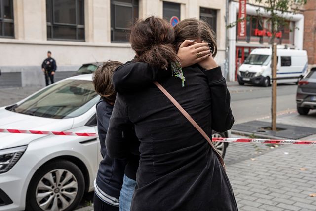 10月13日,在法国北部城市阿拉斯发生袭击事件的甘贝塔高中外,一名家长安慰学生。