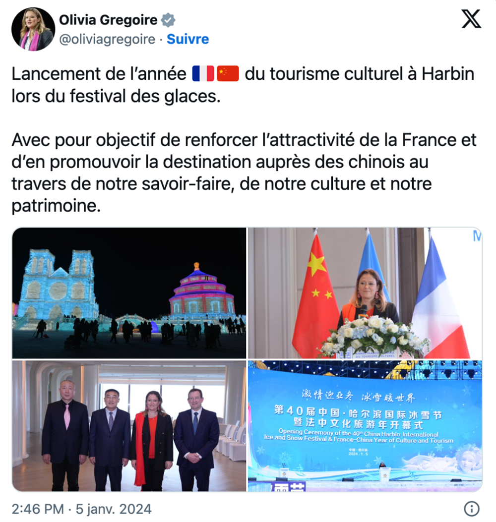 格雷戈尔还通过社媒X上发布“北京天坛”和“巴黎圣母院”冰雕合照,并表示,希望“加强法国吸引力、推动法国文化旅游业,通过我们的技艺、文化、传承吸引中国游客”。
