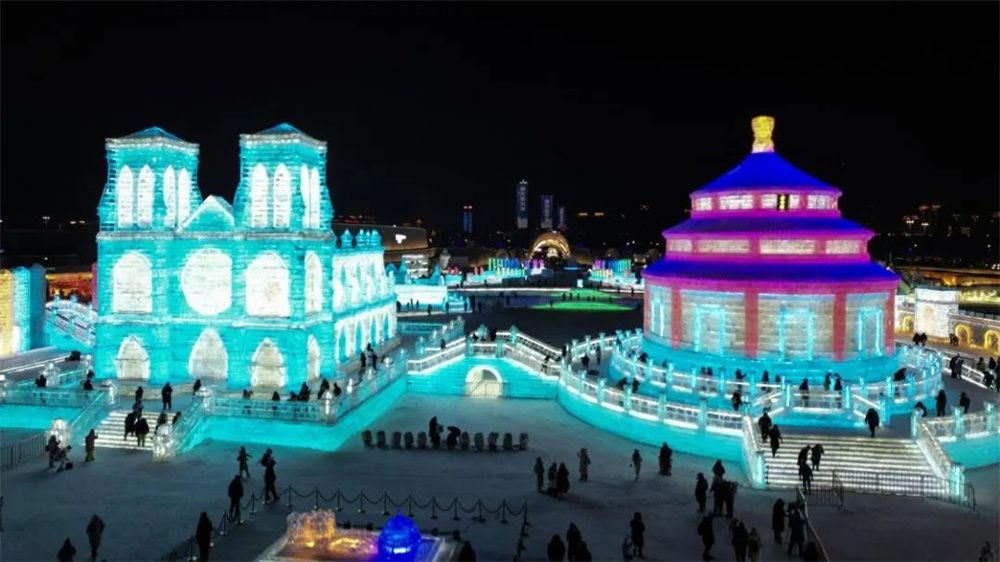 新华社表示,哈尔滨冰雪大世界,以天坛和巴黎圣母院为灵感,建造“童话王国”景观群。这是一座代表友谊的桥梁,将两个区域的冰建景观连接在一起,把法国建筑文化、中国传统文化,向中法两国建交60周年隆重献礼。以相近角度细细端详实景与冰雕,感受中法文化相融的浪漫与风情。
