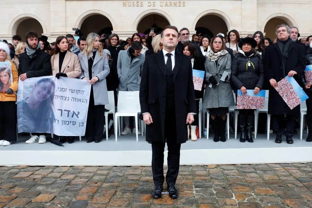 法国总统马克龙于当地时间2月7日参加全国性哀悼仪式,追悼在2023年10月7日由哈马斯发起的无差别攻击中死去的法国公民。(图片来源:法新社)