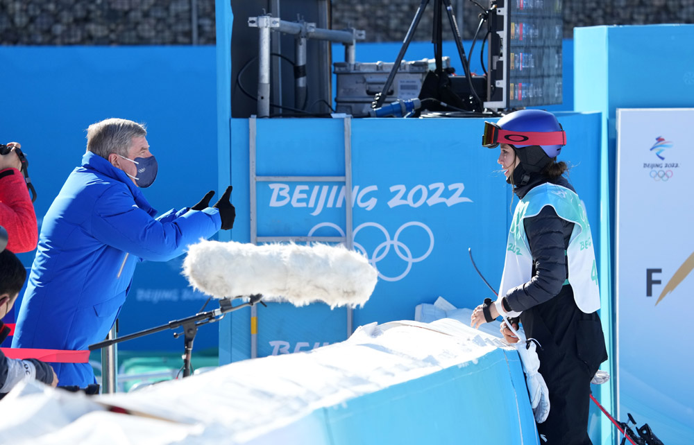 谷爱凌比赛结束后,在场边观赛的国际奥委会主席巴赫向获得冠军的谷爱凌竖起大拇指祝贺。(图片来源:中新社)