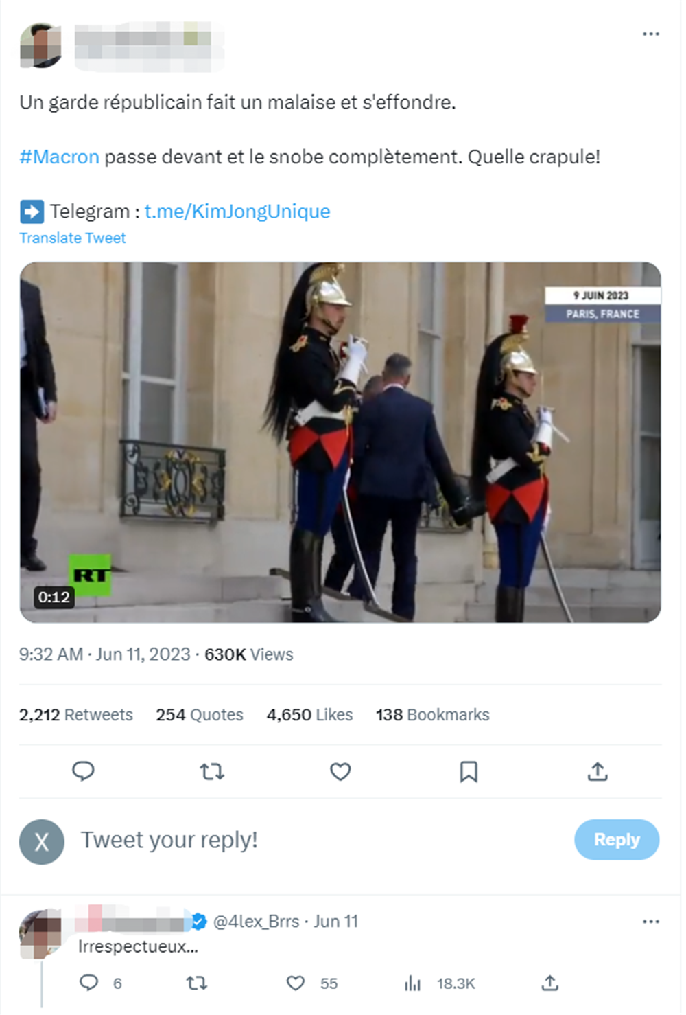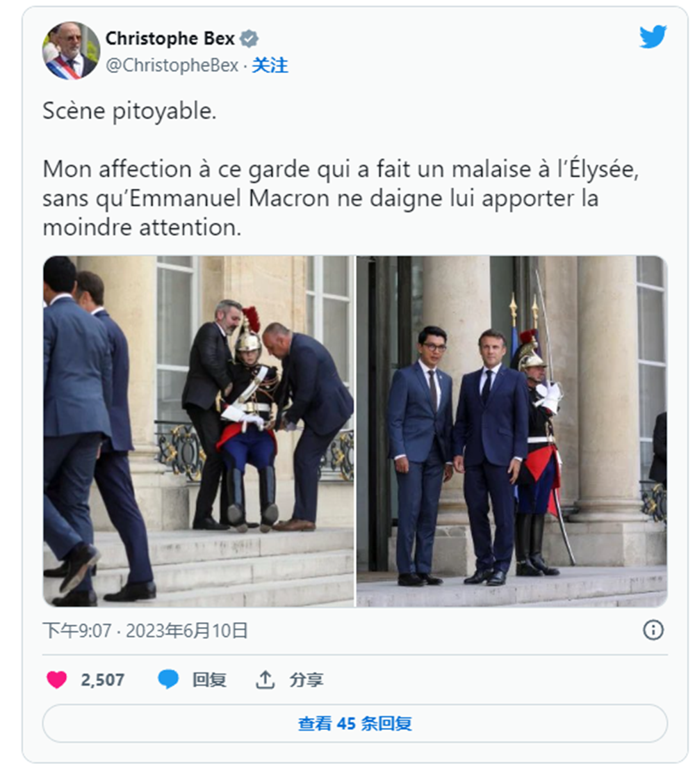 上加龙省的议员克里斯托夫·贝克斯(Christophe Bex)谴责了这样一个“可怜的场景”:“我很同情这位在爱丽舍宫晕倒的警卫,埃马纽埃尔·马克龙却没有给他一丝一毫的关注。”