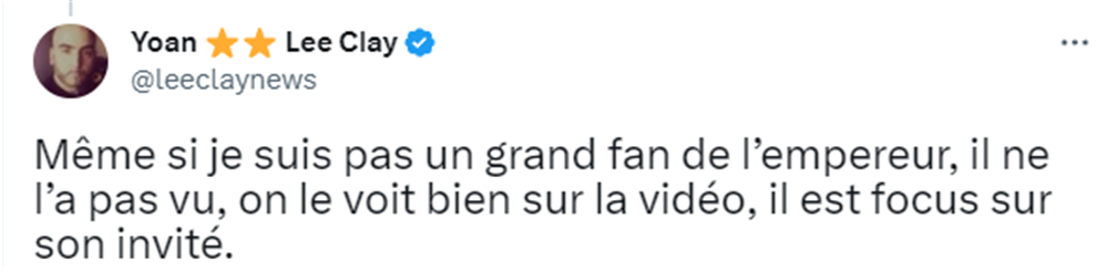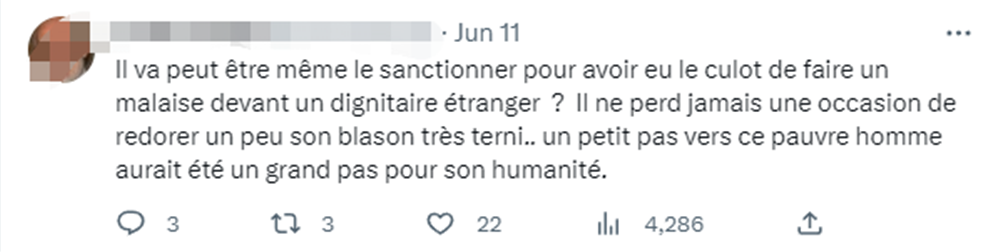 也许他(马克龙)甚至会因为他(倒下的卫兵)胆敢在外国政要面前出丑而惩罚他?他从不放过任何一个恢复自己受损声誉的机会......(如果马克龙能)对这个可怜的人迈出一小步,对他的人性来说就是一大步。