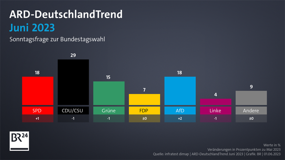 根据“德国趋势”调查,如果本周日德国就举行大选,那么选择党和社民党将各获得18%的选票。该调查上一次是在5月初进行,与当时的结果相比,选择党的得票率提高了足足2个百分点,而社民党则损失了1个百分点。