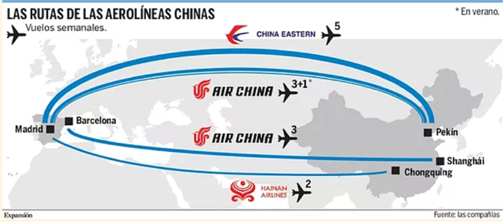 中国国际航空、海南航空和东航恢复了欧中之间的航班。马德里和巴塞罗那与北京、上海,以及重庆等中国城市之间的航线正在逐步恢复。