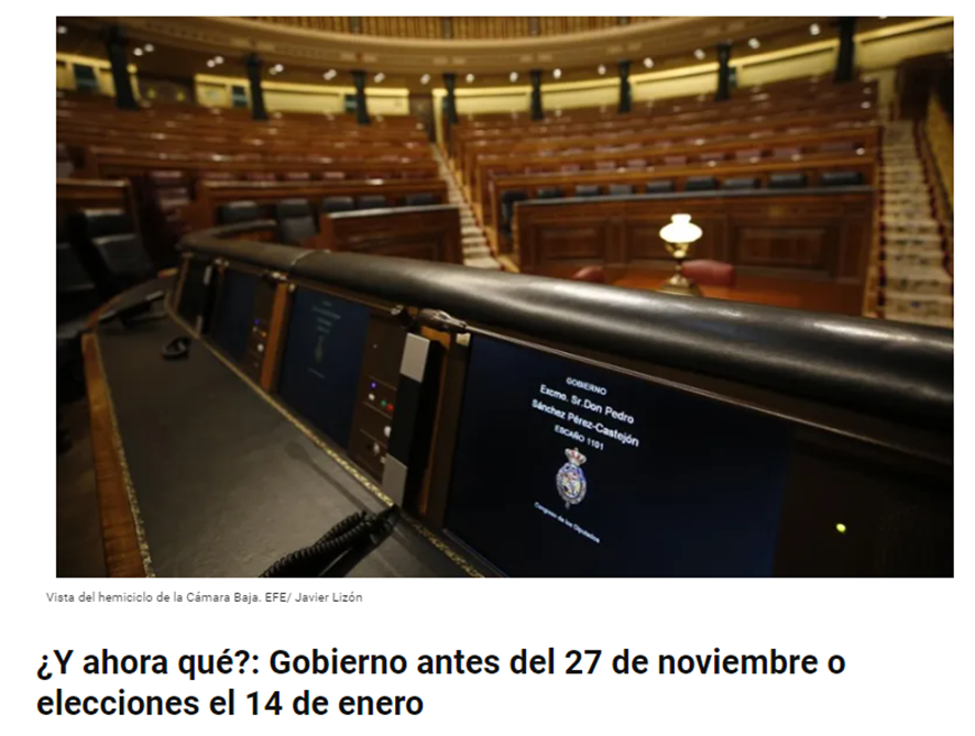 埃菲社报道,9月26日和27日的西班牙首相就职辩论已经限定了两个可能的未来路径:在11月27日前组建新政府,或在1月14日重新大选。此次辩论的焦点是费霍(Pedro Sánchez)能否赢得议会的绝对多数,这一切都取决于9月27日的议会投票。根据西班牙宪法第99条,如果在辩论后的两个月内没有候选人当选,国王将解散议会并于47天后召开新的大选,即1月14日。
