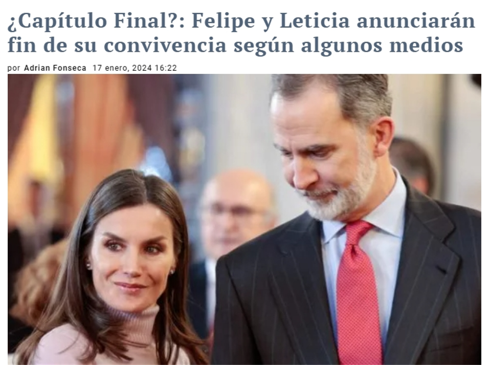 【欧洲时报西班牙版微信公众号“西闻”】Moncloa网站称,目前,费利佩和莱蒂齐亚可能已经分居,尽管他们会继续在公共场合露面。这段王室夫妇将在不久的将来正式宣布离婚。