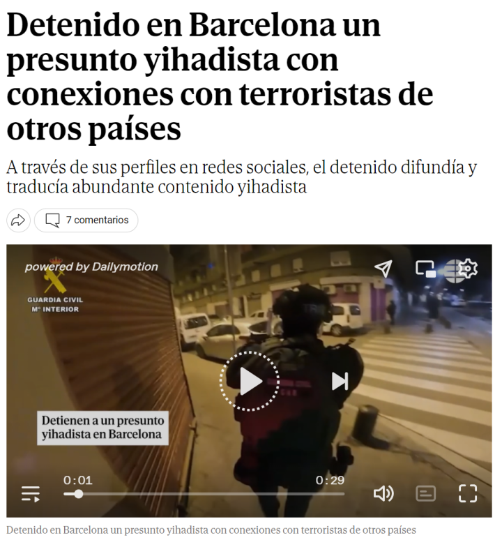 《世界报》报道,国民警卫队在巴塞罗那逮捕了一名据称与恐怖组织达阿什(Dáesh)有联系的男子,该男子与其他国家的圣战分子保持着联系,因为他们发现他一直在进行有利于恐怖主义的宣传活动。