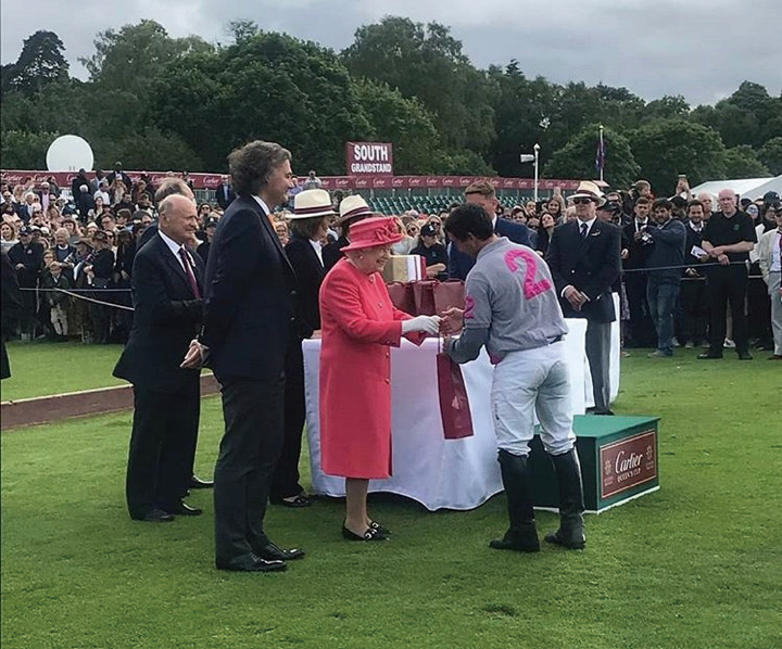 女王为2019年御林军马球俱乐部“女王杯”马球赛冠军队伍颁奖。