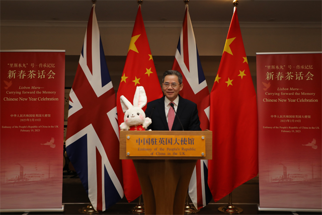 【欧洲时报】2023年2月19日,中国驻英国使馆在英国格洛斯特郡为“里斯本丸”号船幸存者家属及相关人士举行新春招待会,共同庆祝中国农历新年,体验中国传统文化,缅怀1942年中国渔民英勇营救“里斯本丸”号船英军战俘的感人故事。“里斯本丸”号船幸存者丹尼斯·莫利之女丹妮丝·维尼、长期致力于收集整理“里斯本丸”号营救事件资料的英国退役少校费恩祺以及当时乘坐“里斯本丸”号船英军战俘家属代表共150多人参加。中国驻英国大使郑泽光发表致辞。