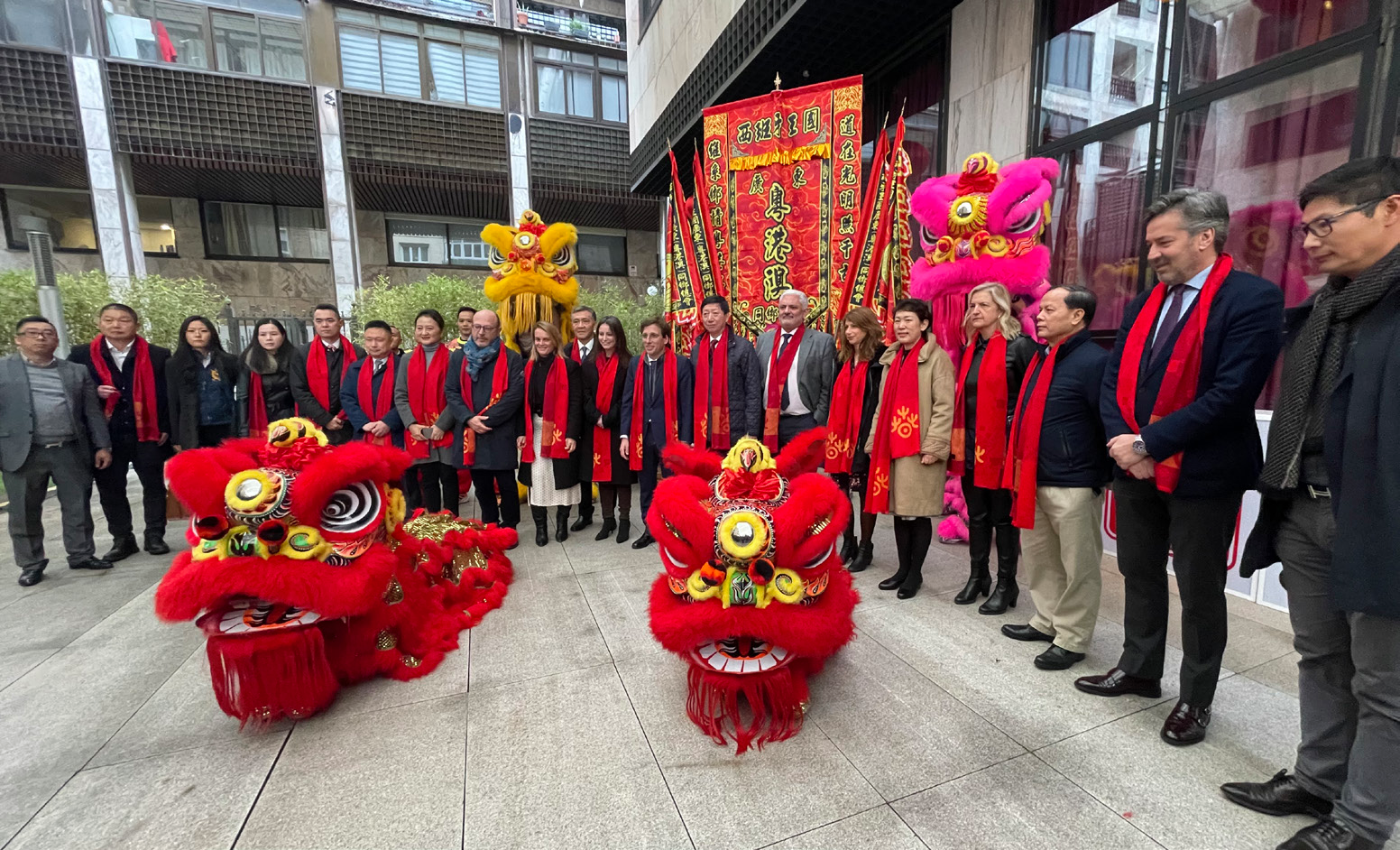1月11日早间12时30分,中西方代表见面,共同欣赏了由西班牙广东(粤港澳)同乡总会成员带来的精彩的舞龙舞狮的节目。锣鼓喧天,舞狮演员精彩的演出赢得了来宾们的掌声。