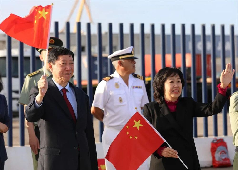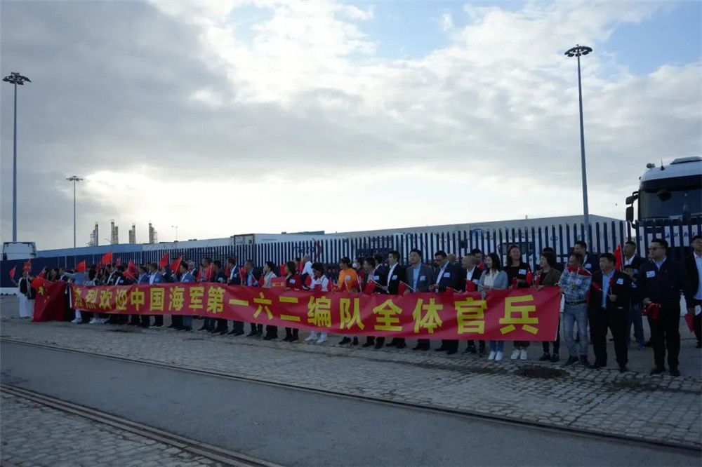 欢迎队伍手持中国国旗和横幅,热情欢迎中国海军抵港。