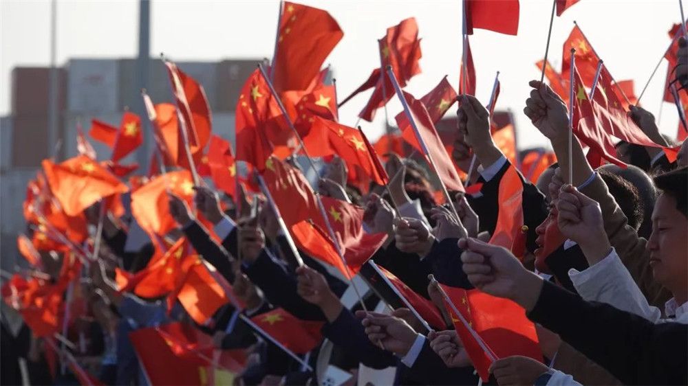 众人手举中国国旗和欢迎横幅,高喊口号,热烈欢迎中国军舰抵达港口。