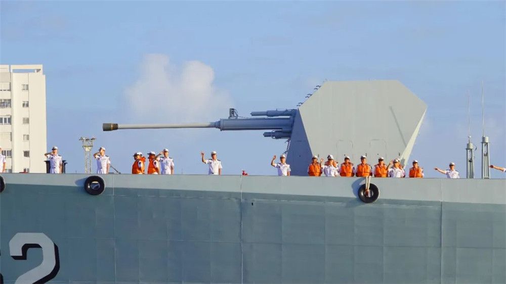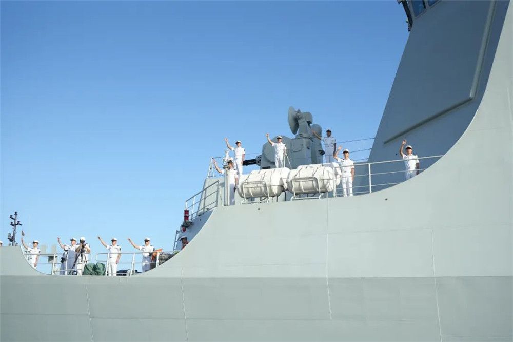 南宁舰海军官兵列队船舷,与欢迎队伍挥手致意。