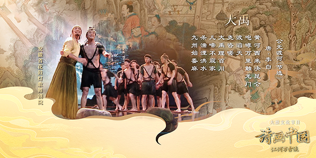 “江河”代表了长江、黄河、大运河等具象的水系,“万古”则代表了源远流长的历史与文脉,两相结合绘就一幅江河文明延绵发展的绚丽画卷。《诗画中国·江河万古流》节目在全新的视角下对“江河”“万古”两个概念的虚实融合探索。比如节目的最后一期,通过当代创作者演绎的民族舞剧《大禹》,生动再现了《仿唐人大禹治水图》轴的精妙技法,又展现出黄河之畔大禹率众治水的民族史诗。“江河万古流”的切入点,让藏在诗画中的江河文明脉络重现光彩。
